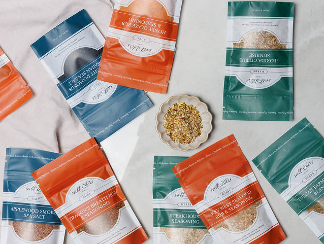 We created a fully printed pouch with a clear window so you can see the amazing product inside! The bold new colors aren't just beautiful - they represent the different categories of products at Salt Sisters. In this case: orange for rubs, green for herbs, blue for salts, and yellow for dips.